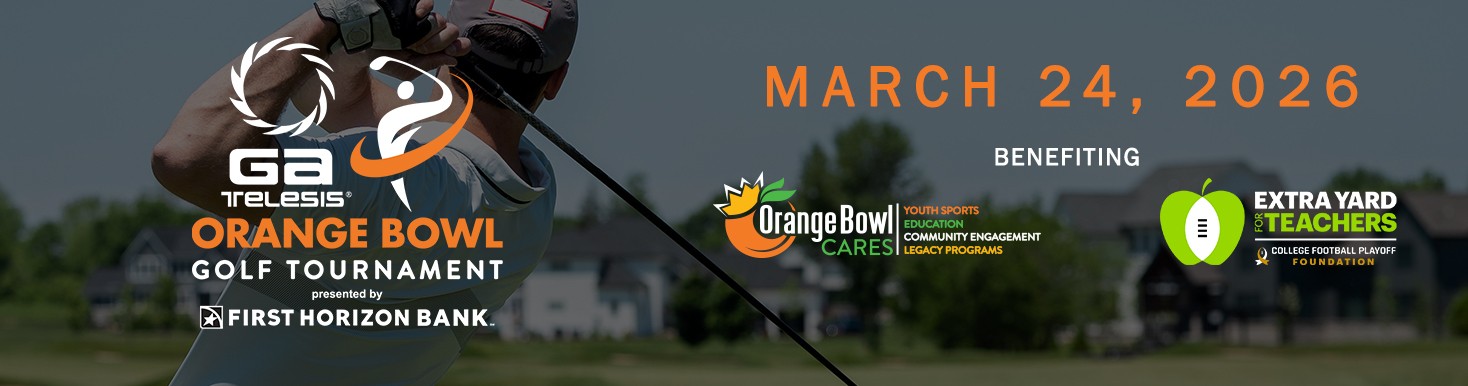 The 2026 GA Telesis Orange Bowl Golf Tournament presented by First Horizon benefits two remarkable charitable beneficiaries: Orange Bowl Cares and the College Football Playoff Foundation’s Extra Yard for Teachers. The Orange Bowl Cares initiative seeks to continually improve our South Florida home through four pillar areas of focus: youth sports, education, community engagement, and legacy program revitalizations of sports facilities and school media centers. The Extra Yard for Teachers platform elevates the teaching profession by inspiring and empowering teachers by implementing programs in four focus areas: resources, recognition, recruitment, and professional development.